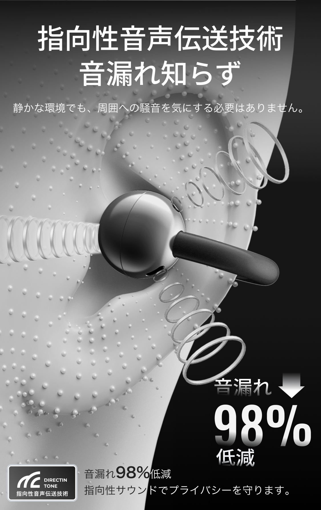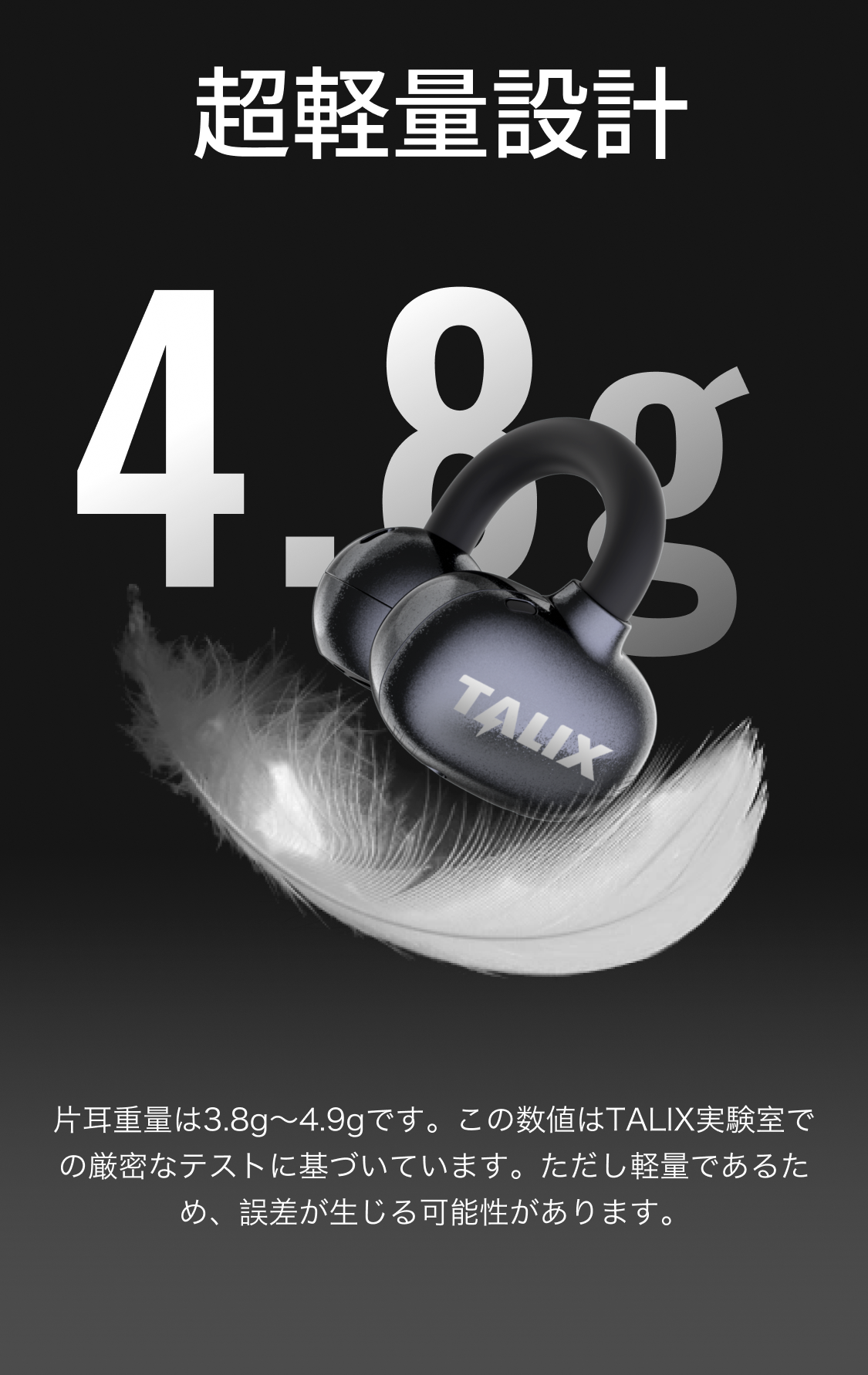 ●極めて軽く、装着感がない:片耳の重さは4.8 gで、ほとんどA 4紙1枚の重さに相当する。耳掛け式のデザインを採用しており、しっかりしていて落とすことができず、多くのユーザーが「自分がまだつけていることをよく忘れている」とフィードバックし、長時間耳をつけても痛みがない。