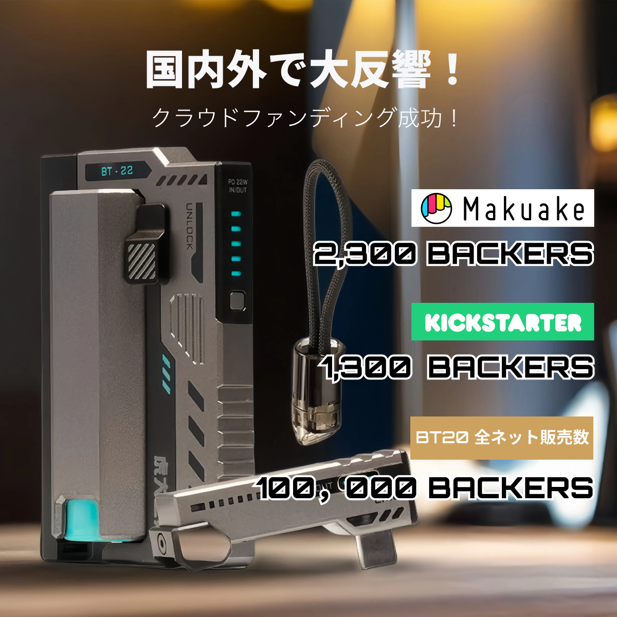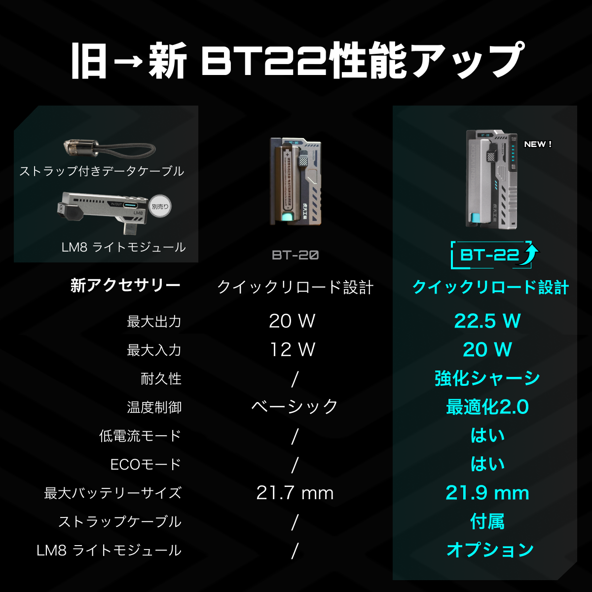 A:BT22は、デザイン、充電効率、互換性においてBT20からさらに進化しています。具体的には、最大出力が22Wに向上し、新たに独立した懐中電灯モジュールの拡張機能を備えている点が主な違いです。製品比較図もご参照ください。
