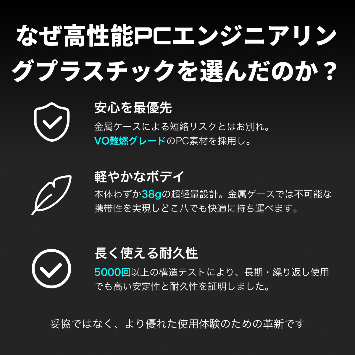 A:急速充電時にはチップ周辺に熱が集中することがありますが、本品は智能温度制御システムを搭載しており、握る部分の温度は快適な範囲に保たれます。万が一高温(約50℃以上)になると自動的に出力を調整し、安全性を確保します。